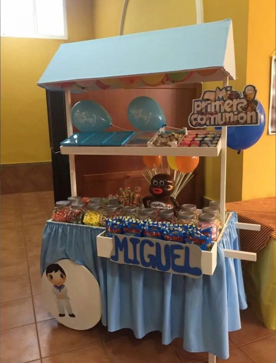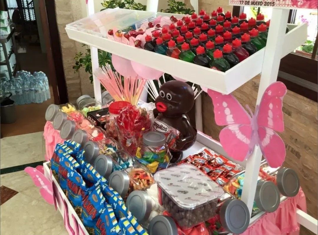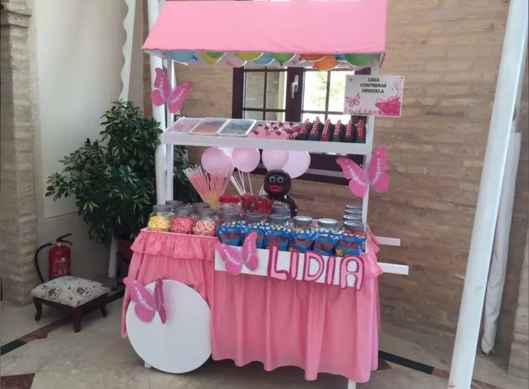 Carro de madera de color blanco personalizable con telas de color azul o rosa para usarse como carrito de chuches, carro de presentación de quesos, carro de bebidas etc...