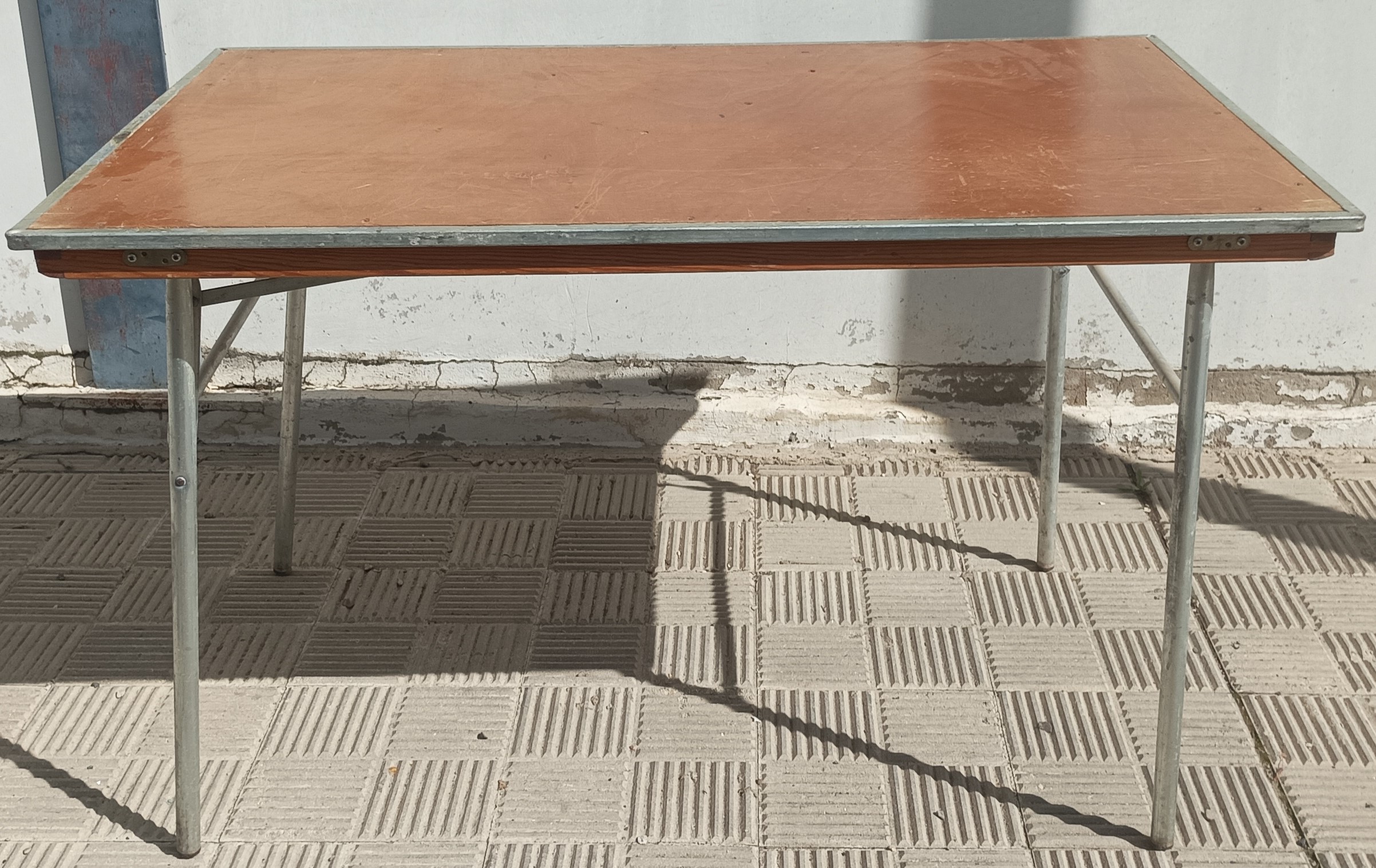 Mesa rectangular de 1,25 x 0,75 cm de tarima y una altura de 0,75 cm con patas abatibles que resulta fácil de montar, desmontar y transportar.