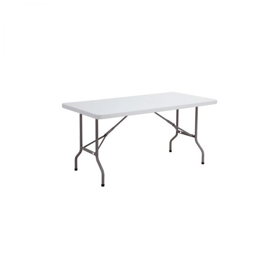 Mesa plegable con estructura de acero pintado y sobre estanco de polietileno de alta densidad, en color gris claro.