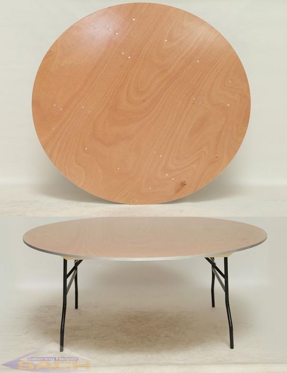 Mesa redonda con tarima de 160 cm de diámetro y 0,74 cm de altura y patas abatibles que resulta muy fácil de montar y desmontar. Para transportar esta mesa debemos tener en cuenta su diámetro, ya que su tarima mide 160 cm y no es plegable, sólo se abaten las patas.