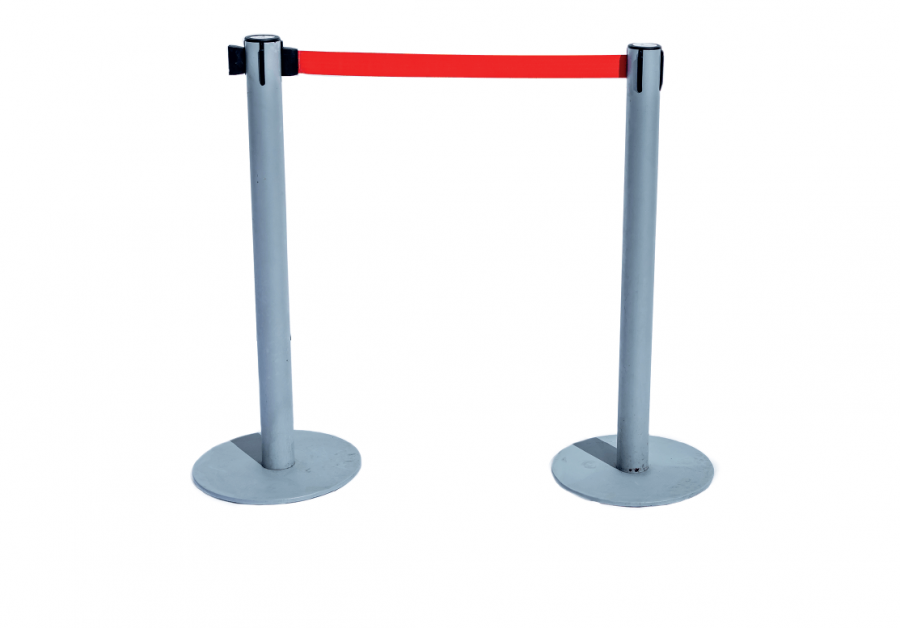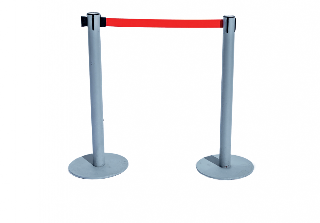 Poste de separación gris plata con cinta retráctil roja hasta 3m de separación.
