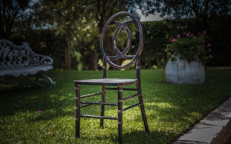 Elegante silla de madera, con diseño en madera de color negro decapado.