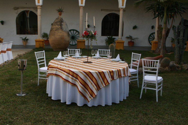 Cubre mantel para mesas redondas de 1,60 y 1,80 M de rayas tricolor (beige, roja y blanca)