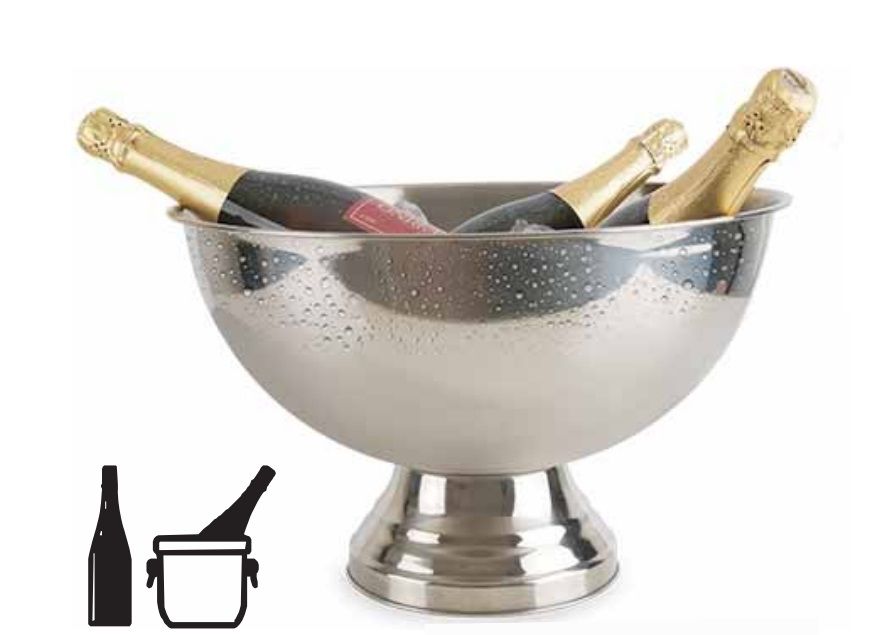 Champanera metálica fabricada en acero inoxidable, lo que la convierte en una pieza muy resistente dentro de los servicios de mesa