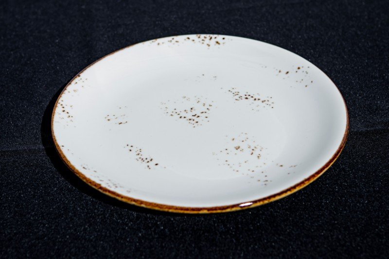 Plato llano de cerámica con filo de color beige y decoración aleatoria en forma de pintas de color beige