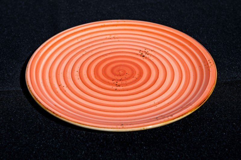 Plato llano de cerámica con decoración en forma de espiral creando un efecto hipnótico